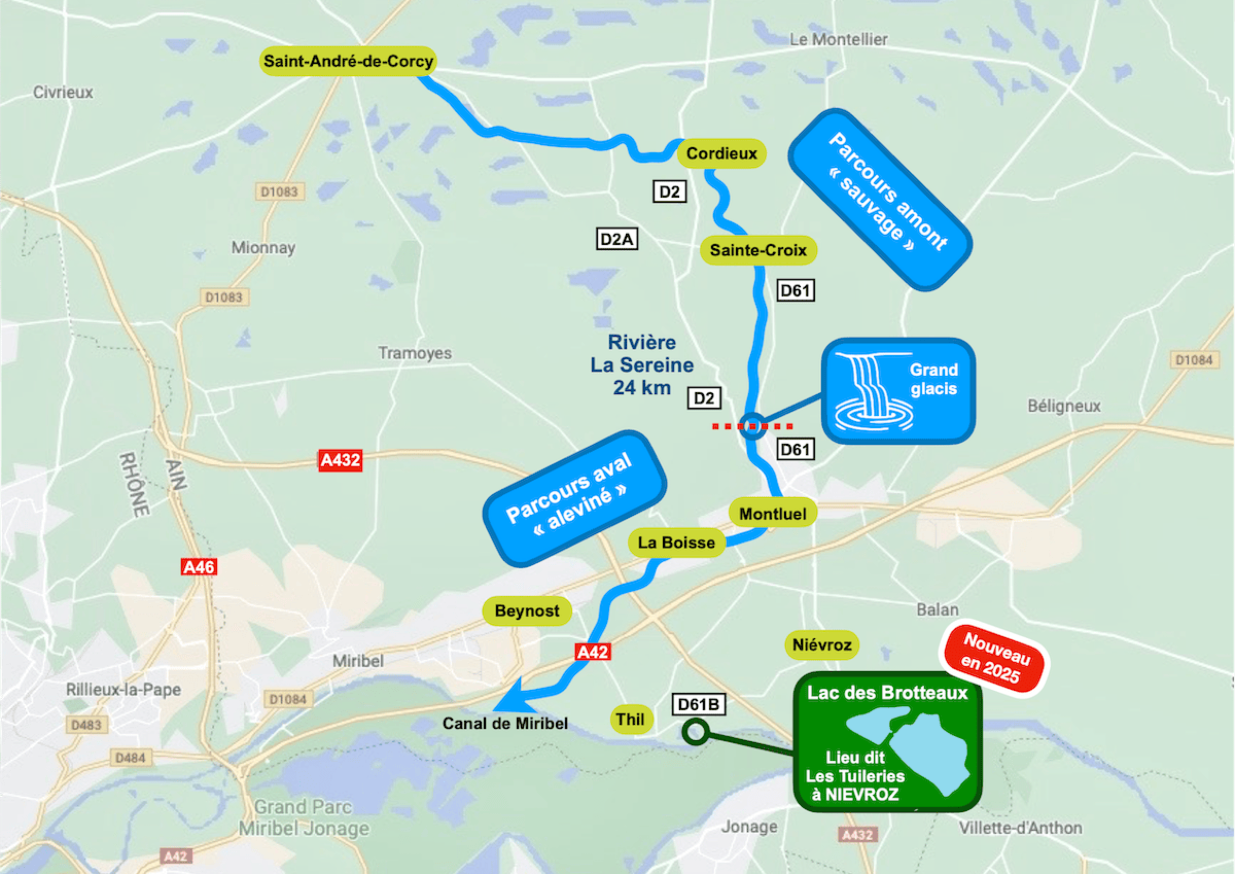 Sinueuse, elle prend sa source sur la commune de Saint André de Corcy puis serpente à travers Cordieux, Sainte Croix, Montluel, La Boisse, Thil et Beynost pour se jeter dans le canal de Miribel.