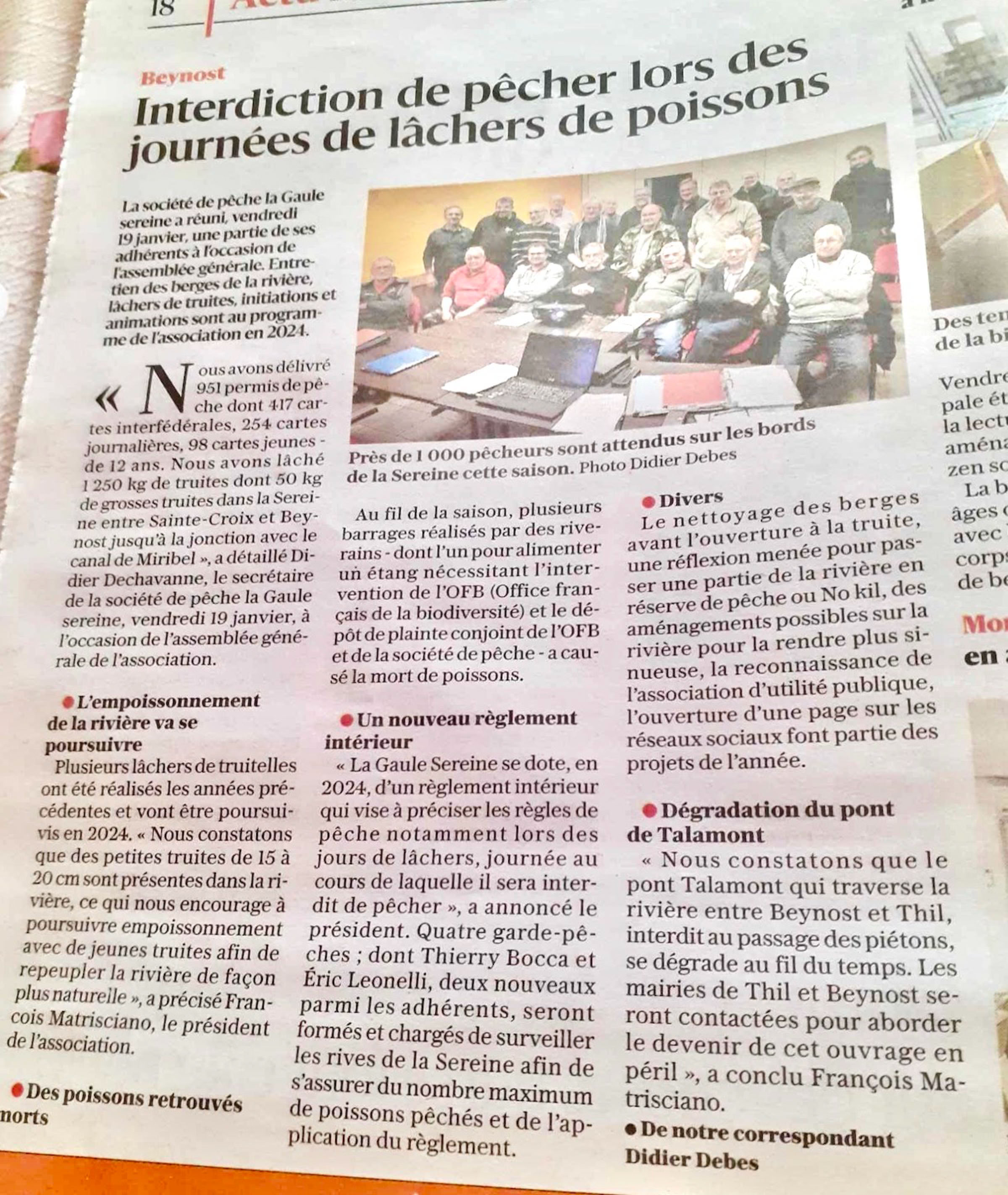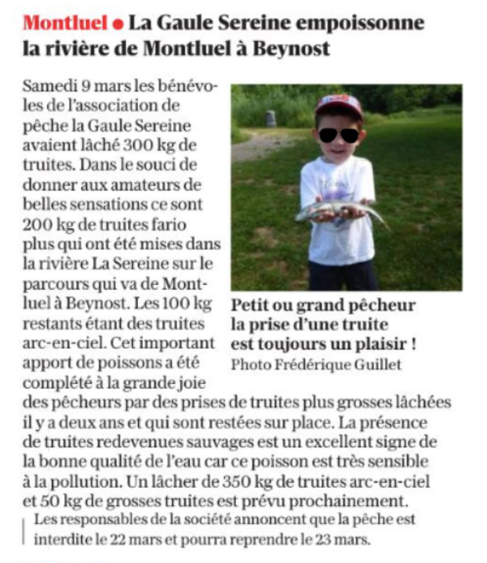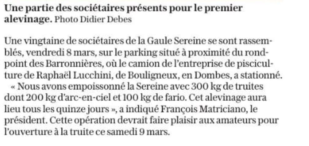 Les bénévoles de l’association « La Gaule Sereine » avaient lâché 300kg de truites (100kg d'arc-en-ciel et 200kg de fario) de Montluel à Beynost.