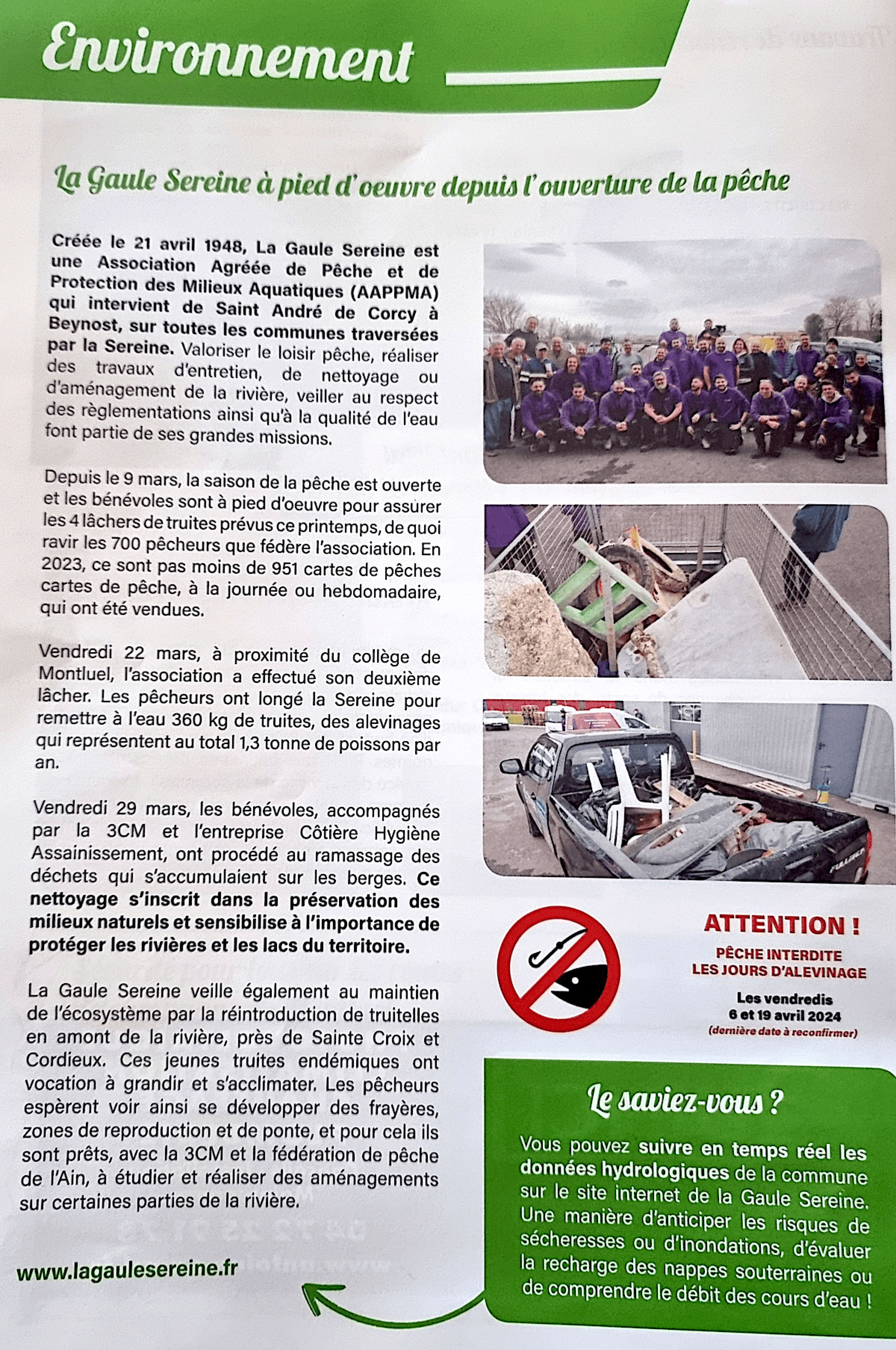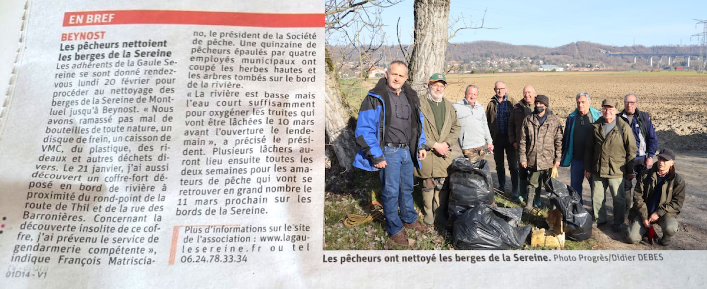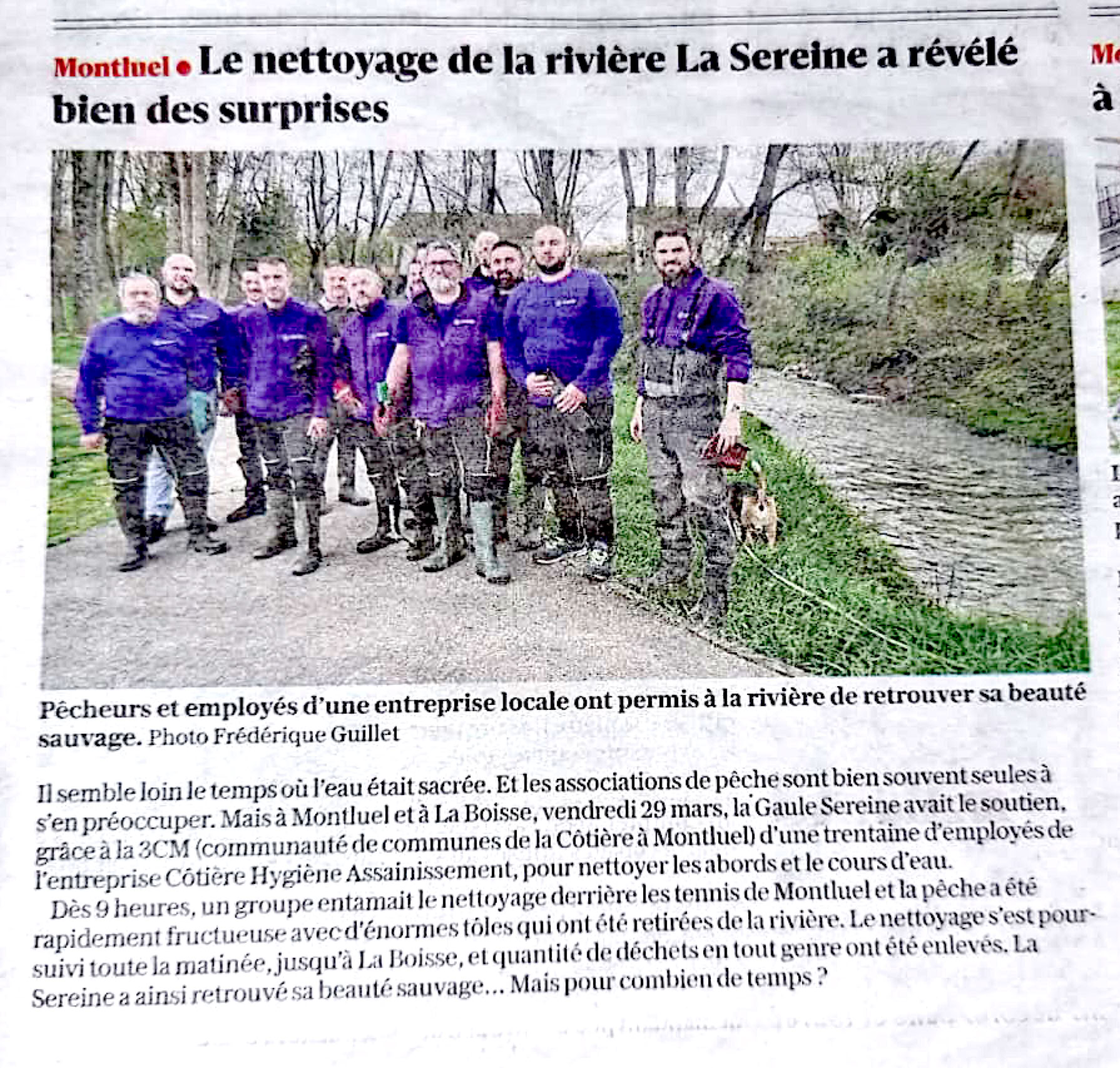 Le 29 mars 2024, notre AAPPMA La Gaule Sereine et l’entreprise CHA (Côtière Hygiène Assainissement), associées à la communauté de communes de Montluel ont procéder à un nettoyage de la rivière La Sereine.