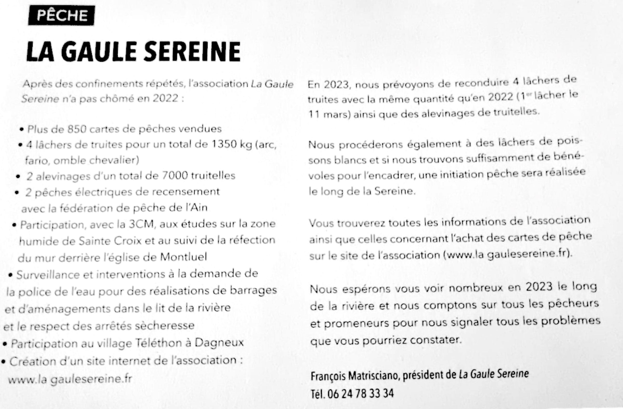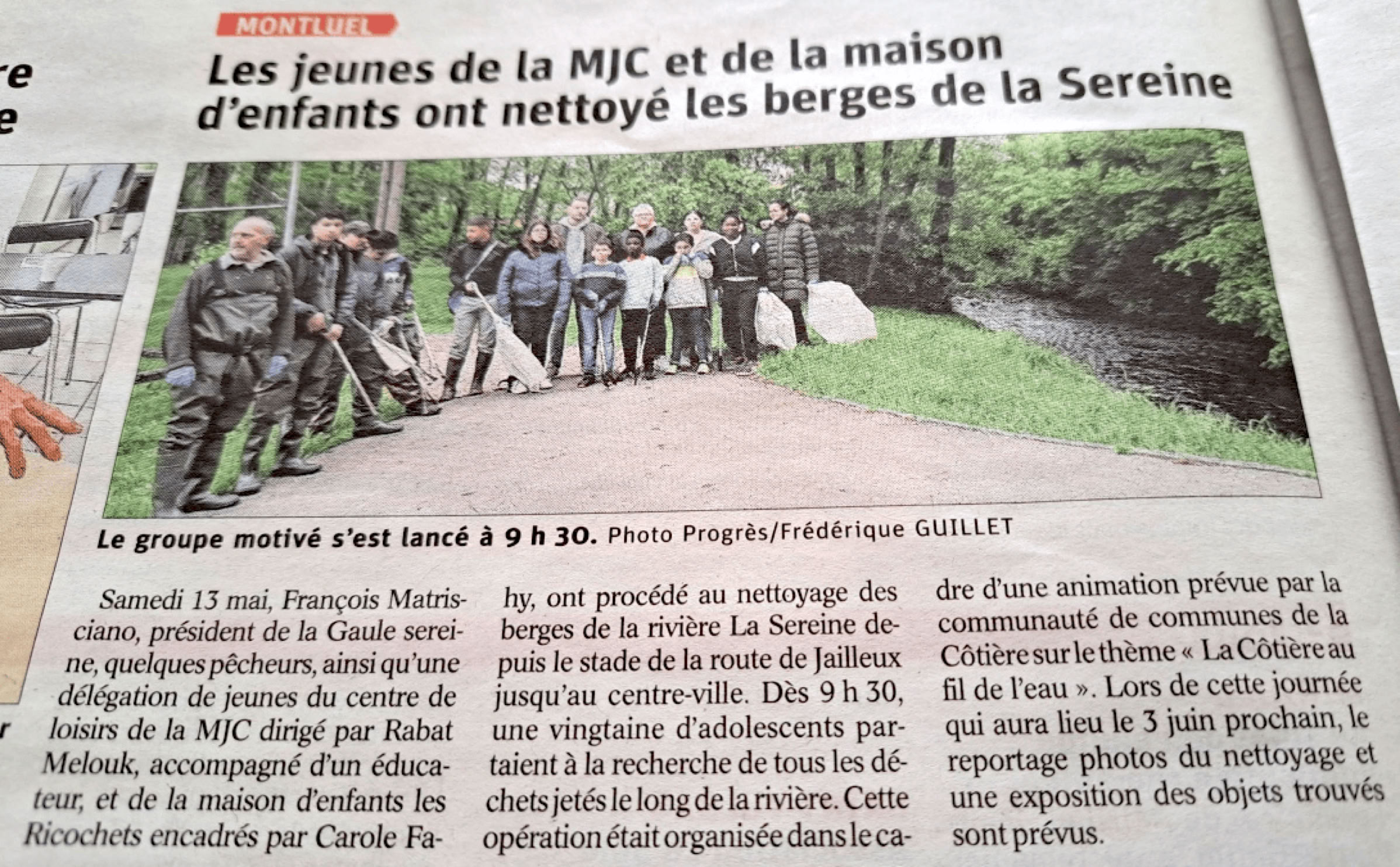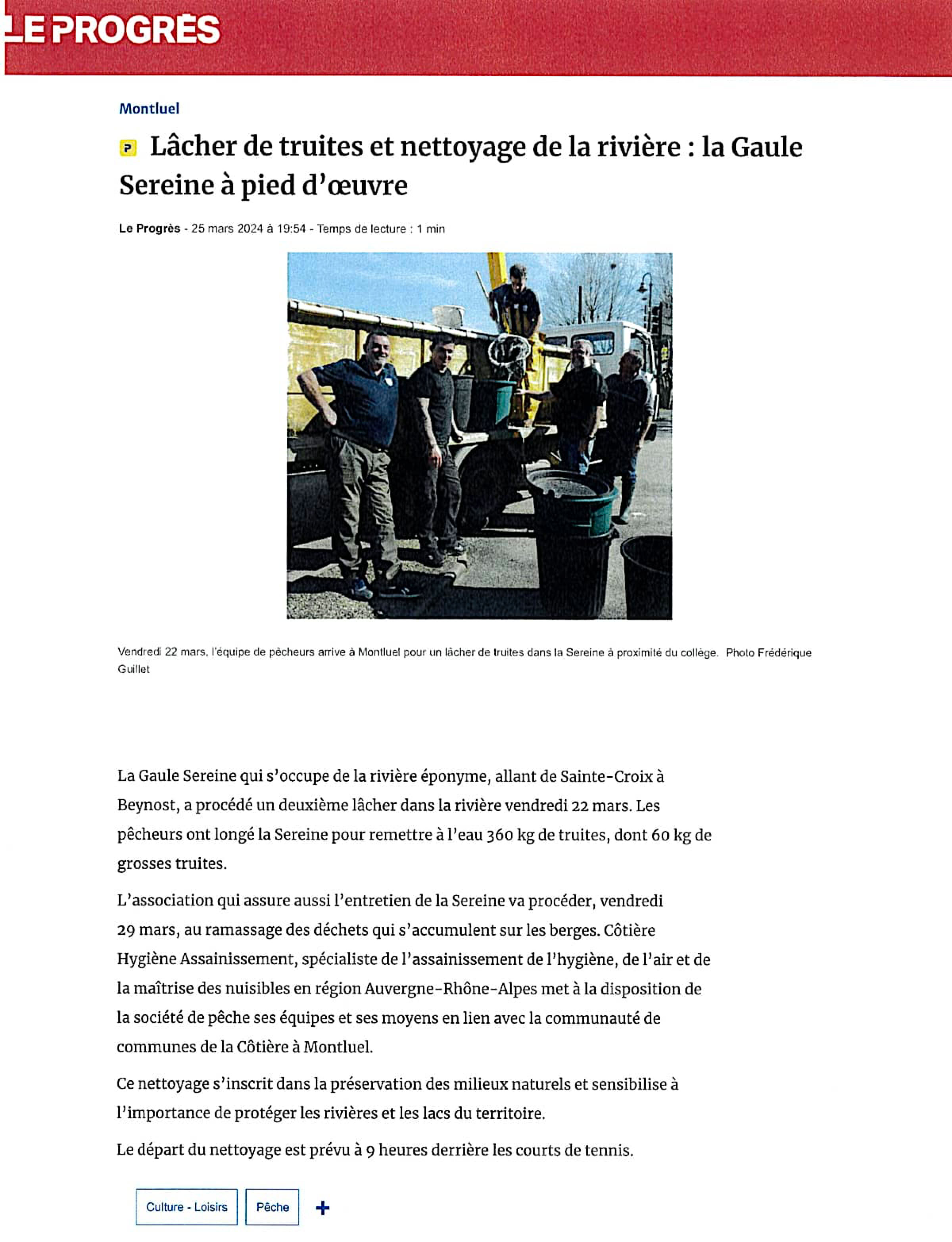 Le 29 mars 2024, notre AAPPMA La Gaule Sereine et l’entreprise CHA (Côtière Hygiène Assainissement), associées à la communauté de communes de Montluel ont procéder à un nettoyage de la rivière La Sereine.